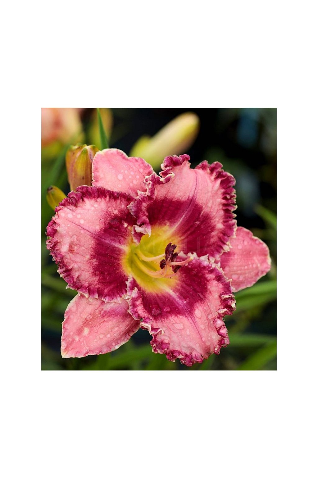 – krémově růžová s velkým jasně červeným chevronovým okem a rudozlatým, nařaseným, hrbolatým okrajem ve stylu cukrového jablka. Průměr květů 14 cm, výška 60 cm.