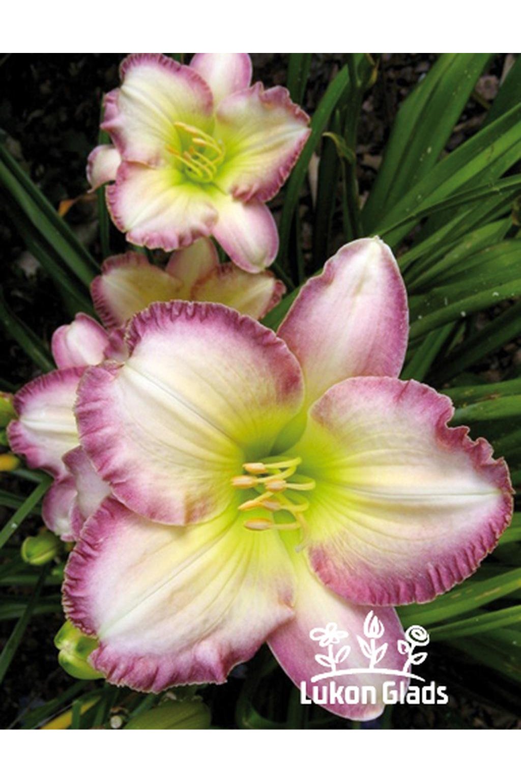 – vynikající smetanově bílé květy s nařasenými růžově fialovými okraji. Hrdlo je žlutě zelené, výška 60 cm. Nevšední barevná kombinace.Doplňkové parametry