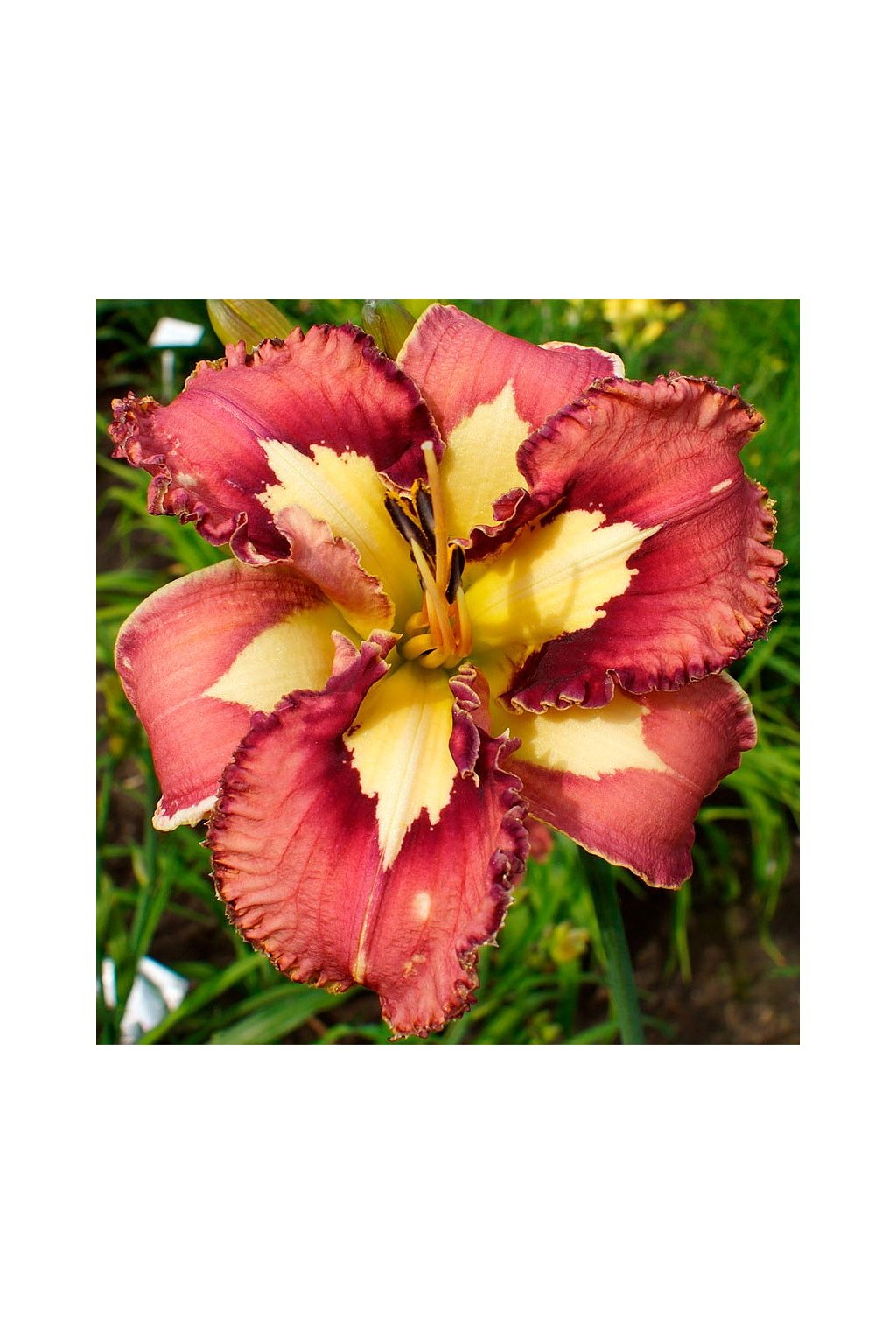 – základní barva okvětních lístků je levandulově růžovo-krémová s fialovým okem a pikoté okrajem naneseným na krémově bílou barvu. Velké, jablkově zelené hrdlo dodává této denivce další rozměr. Květy mají až 15 cm v průměru, výška 70 cm. Opakuje květenství.