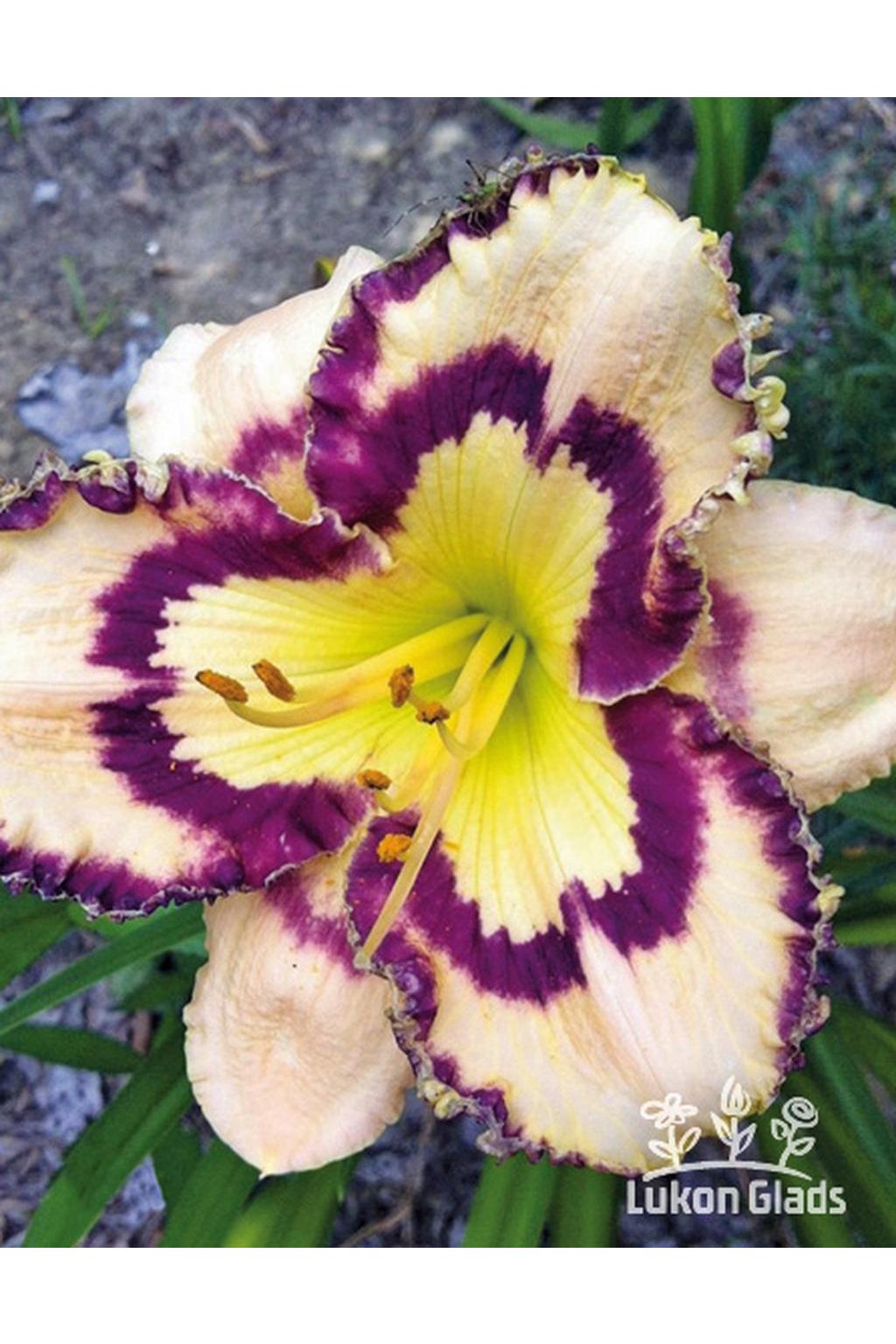 – krémové květy mají velké vínové oko do kterého prosakuje velké žluté hrdlo. Výrazný kontrast žlutého hrdla a vínového oka vytváří výjimečný efekt. Kvete velmi bohatě, výška 70 cm, Ø květů 14 cm.Doplňkové parametry