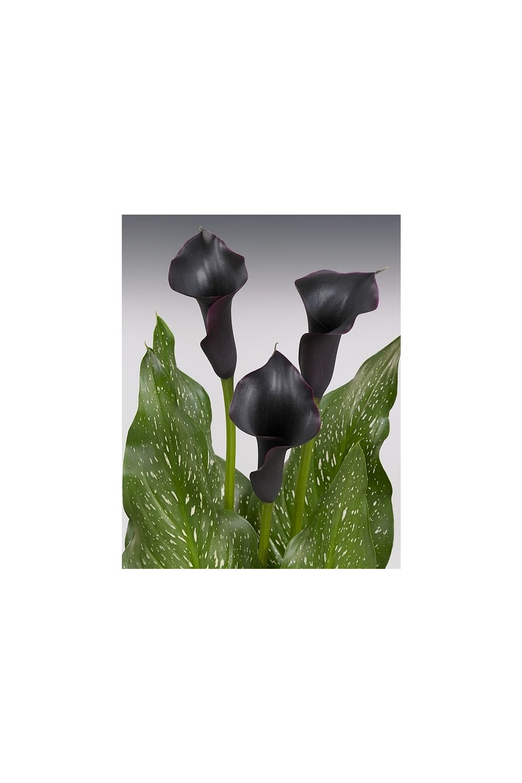 – má skutečně unikátní černofialové až inkoustově černé květy. Kaly tvoří elegantní trubkovité květy, mají vzpřímené zelené, bíle skvrnité listy na dlouhých stoncích. Výška okolo 70 cm. Vyjímečná barva! Velikost 16/18.