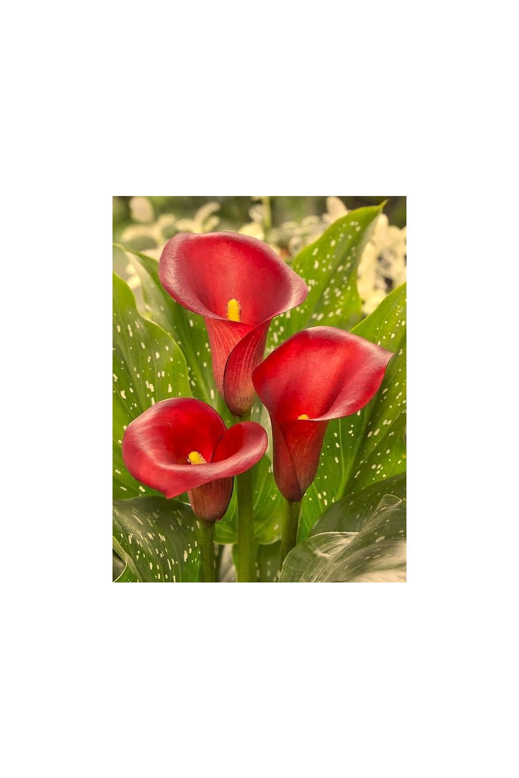– nejčervenější kala, jakou najdete! „Red Symphony“ zaujme svými pravými rubínově červenými, dokonale tvarovanými květy. Listy jsou středně zelené s výraznými bílými skvrnami. Výška 50-70 cm, výborná řezovka. Velikost 16/18.