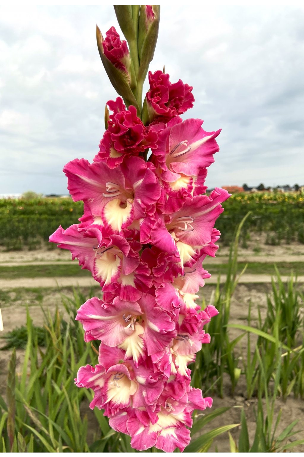 – (Hartline 2013) 345 M. Tmavě růžová, na vnějších částech okvětních lístků s bílým středem a růžovou pikotáží na bílých okvětních lístcích. Otevírá 8-10 nařasených kvítků silné voskovité substance ve formálním umístění. Pevné, dlouhé klasy nesou 23-25 poupat. Úžasná barva!