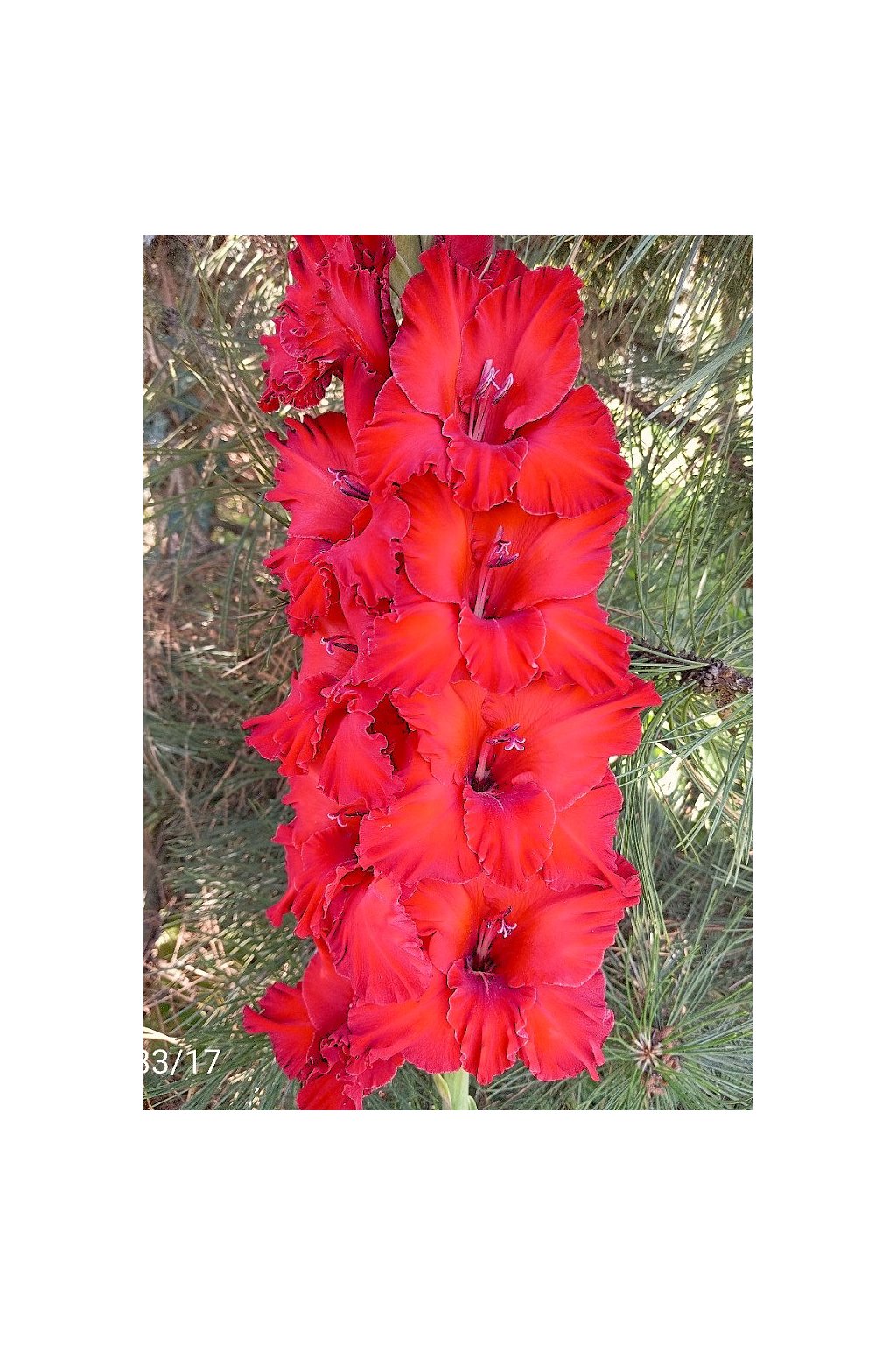 - (Šaran 2026) 468 M (13/13 x PETRA). Květy jsou tmavé vínové barvy, v puku až do černa, hezky tvarované, uspořádané v perfektním dvouřadu. Zvlnění lupenů je elegantní, voskovitost střední, ale květy pevné. Klas udrží v nákvětu 10-11 otevřených květů bez známek vadnutí. Je to zdravá, množivá odrůda, která by mohla být špičkou na výstavních stolech. Semenáč č. 33/17.