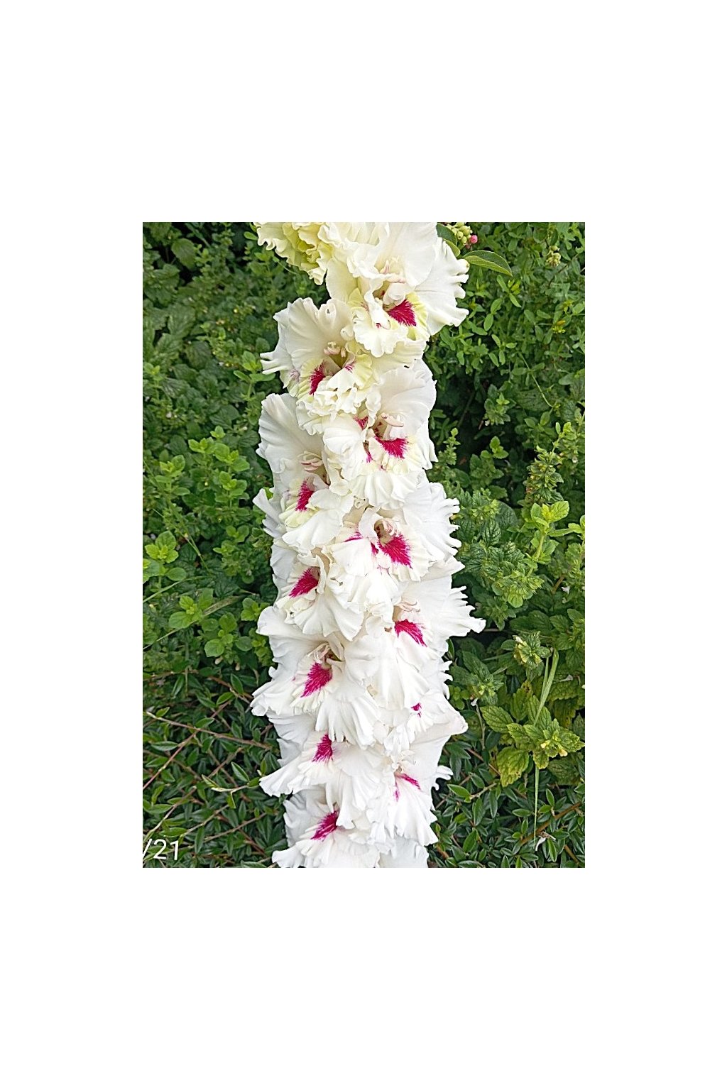 - (Šaran 2026) 301 EM (9/16 x SANTA MARIA). Čistě bílá základní barva je v hrdle vhodně doplněná hezkým vínovým očkem. Květy jsou zvlněné, voskové, uspořádané ve vzorném dvouřadu. Klas s až 26 puky udrží bez problémů 13-14 květů bez známek vadnutí. Budoucí výborná výstavní odrůda je i zdravá a množivá. Semenáč č. 9/21.