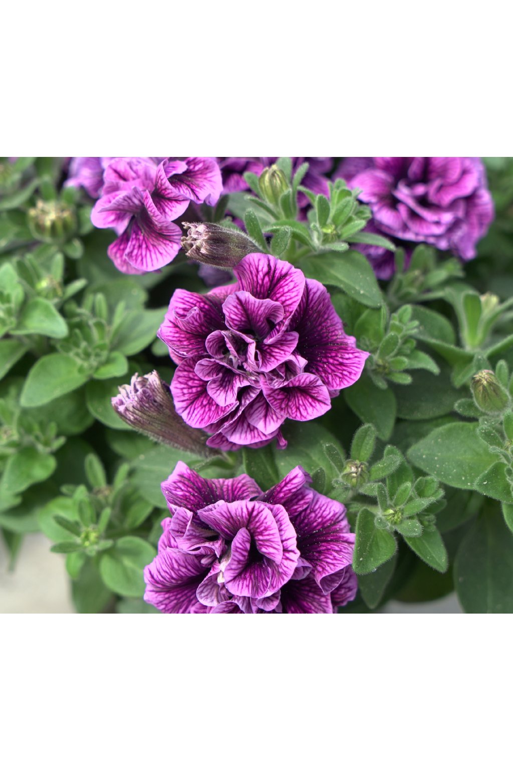 - květy jsou plnokvěté dvoubarevné — kombinují fialovomodré / modrofialové tóny s bílými detaily. Má polopřevislý až převislý růst.