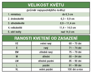 Dále je trojčíslí, ve kterém první číslo udává velikost květu. Další dvě čísla udávají barevný kód – základní barvu květů. Jestliže je na konci trojčíslí liché číslo, značí to, že odrůda má výraznou skvrnu, oko, jazyk, lemování nebo jiný znak, odlišný od základní barvy.